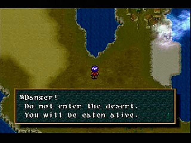Aaaand we’re back with our inept protagonists, who have somehow managed to find their way back onto the world map. After a quick visit to a trader’s caravan to stock up on Light Shrooms and other herbal remedies, they wander around aimlessly until they find another Elw Pyramid. One quick trip into space and back, and they land inside yet another pyramid, this one a stone’s throw from Port Timney. They inspect a handy sign warning of imminent death should they stray into the nearby desert, make a mental note of its location for when they’re inevitably sent there on some quest or other, then finally enter the town, hoping its inhabitants haven’t yet been sucked up into the Mothership like the populace of the previous stop on their magical mystery tour.