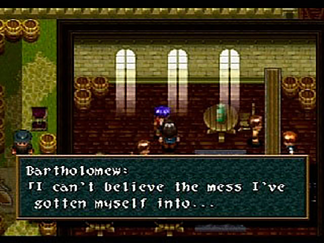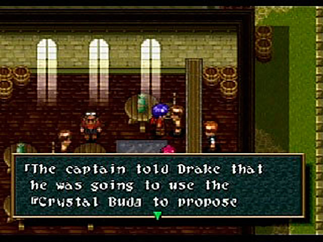 It would be funny (to me, if nobody else) if this statue turned out to be, like, a bust of Cesuelia or something, but to anyone who’s ever played an RPG before it should be pretty obvious he’s talking about the last Guardian Statue. How it ended up in the sea is anyone’s guess, however. The next stop on the info trail is the favourite haunt of any self-respecting sailor, the local pub. Inside, a magenta-haired tavern wench accosts the party and mentions someone named Captain Bartholomew, stating that he’s “a nice man, in spite of his strange antics”. That alone would normally raise concern, but her next sentence seals the deal: “Can you help him out? He seems a little depressed…” Fucking great, Rudy thinks. A town full of hot sailors, and I get saddled with their deadbeat captain and his “strange antics”. This is so not my day.