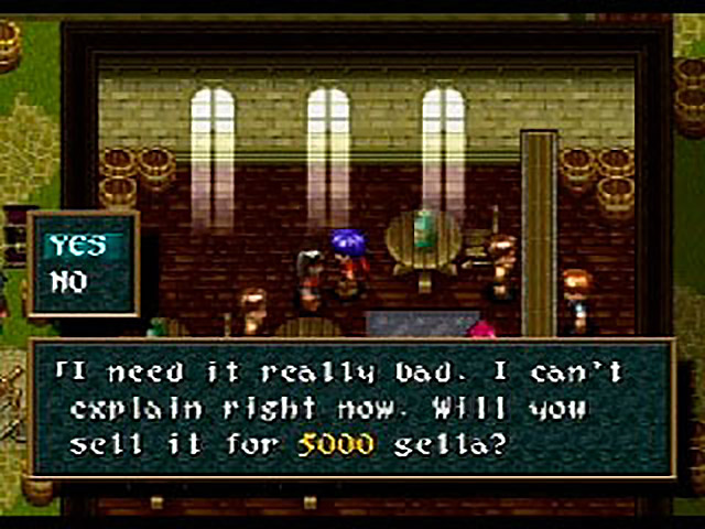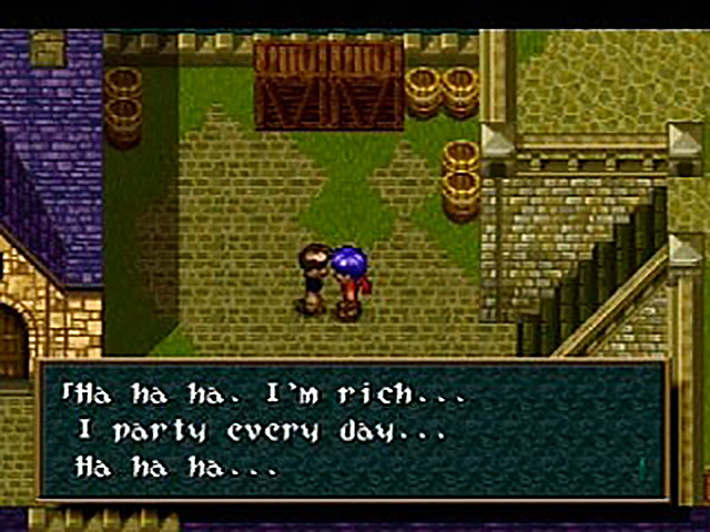 Without another word, Crate Guy dashes in a circle around the rich douchecanoe nearby, then hands something…suspicious over to Rudy. It’s the dude’s bulging wallet, and amazingly it only takes Indy about two seconds to realize Crate Guy is a pickpocket. Predictably, Miss Goody Two Shoes snits “We won’t take dirty money.” Don’t speak for me, bitch. But because Cesuelia is apparently some kind of moral compass for the player, I don’t even get a choice — Crate Guy reluctantly slips the wallet back in Rich Dude’s pocket. Fuck.