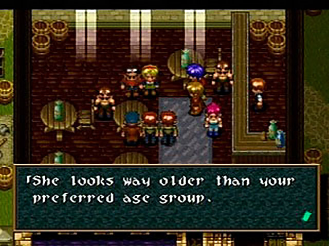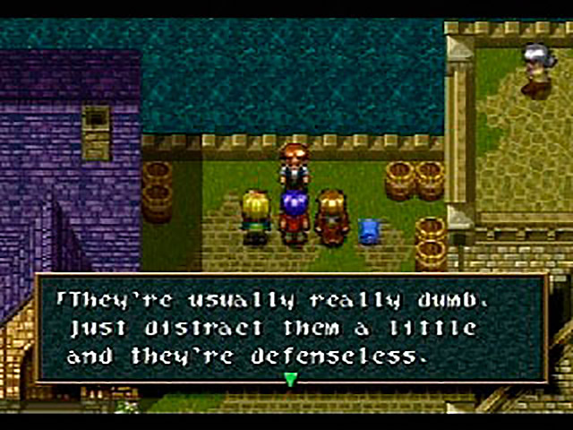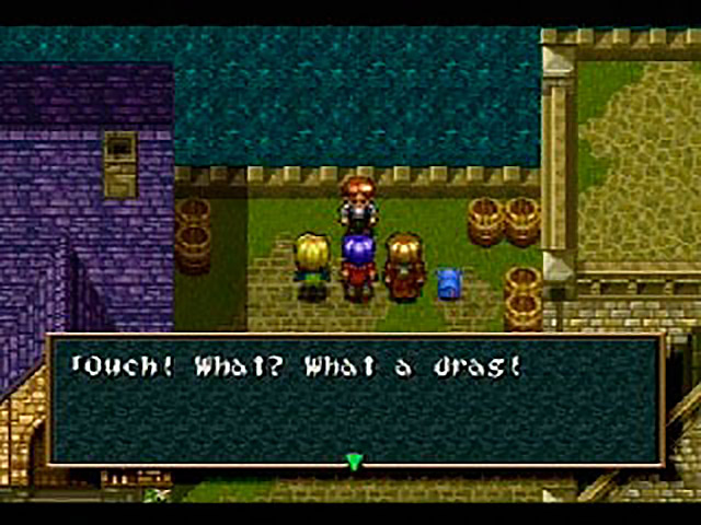 The Maze of Death is a bitch to locate. I’m not sure if I’ve mentioned this before, but on the world map the camera zooms in on Rudy (or whoever is currently leading the group) the closer he gets to a town or dungeon. This is usually pretty redundant, as the locations in question are obviously visible (the face-clawing radar system was only introduced in the sequel). But because the game designers hate me, the Maze of Death is fucking invisible, meaning that I have to trawl every God-forsaken inch of the desert to the west until I see the camera do its tell-tale zoom. Then and only then can I actually press X to be transported inside the dungeon. Fuck off, game designers.
