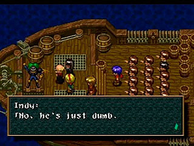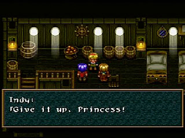 Drawing his massive katana, Baboo sniffs “You, so-called warriors, will die before your sacred statue” and then drags them into an impromptu boss fight. Sadly, Baboo’s awesomeness doesn’t quite carry over into the battle — even his deadliest attack barely gives Cesuelia a scratch. A few rounds later Baboo is brought to his knees, wailing about how unfair it was that he had to fight three people by himself. Vowing that next time will be different (don’t they always?) he vanishes, leaving Indy to gloat “I’m glad we fought well against that fool. We saved the statue.” OR DID THEY?