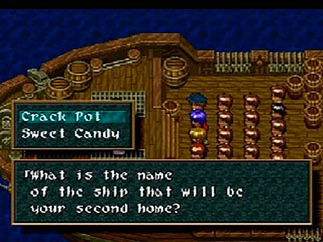 “We’re gathering here, under the eyes of the Guardians,” the minister declares (the bride walks forward). “Bride, what is your name?” (Olivia Clare) It’s interesting to note that the guests whoop and cheer when Cesuelia gives the right answer, yet laugh themselves silly if she messes up. Just whose side are they on? On and on the charade continues, with the minister asking Cesuelia for the names of the man she’s “giving [her] love to” (Bartholomew Capt. Seymour, obviously) and the vessel they’re currently standing on (Sweet Ass Candy). Turning philosophical, the minister asks “what will guide [her] through the maze of life…” For some reason I don’t care enough to remember, the correct option is (GameFAQs Old Moon). She is then ordered to hold up her glass (in her right hand) and to accept the “jewel of the future” (the motherfucking Crystal Bud, of course). God, this is almost as boring as a real wedding.