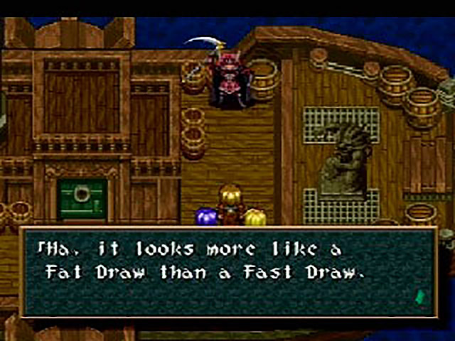 But the scene isn’t over yet. Cesuelia looks to the heavens and wails in despair “The last of the seals has been broken. We can not stop the resurrection of the Mother. The Tear Drop my mother gave me is going to be used to destroy the whole world…” Meanwhile, Indy stares at his feet and whispers to himself “[Scorpina]…Does she also use the Fast Draw…” You know what, I can’t hold back anymore. DURRRRR! DUUUURRRRRRRRRRRRR!