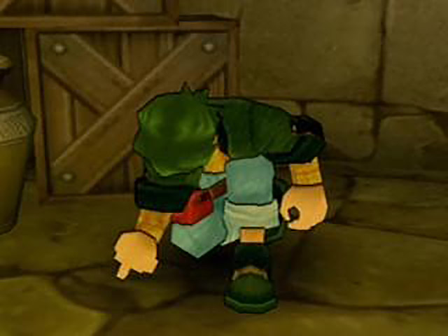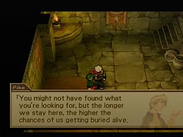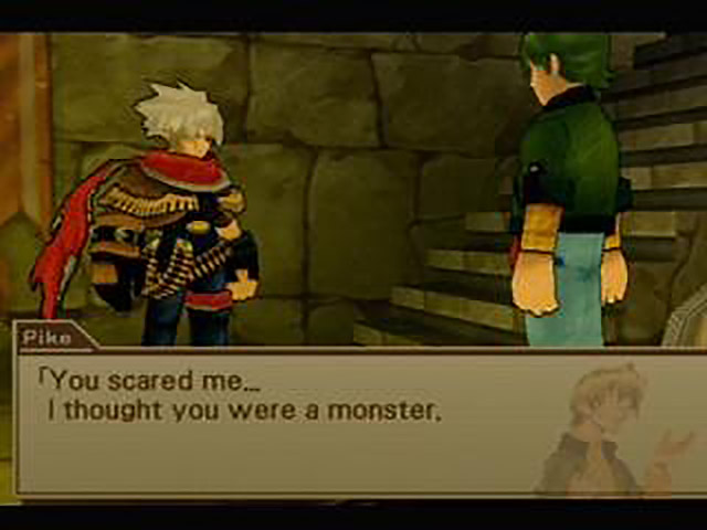 Only marginally less annoying than the others is Annette, the young girl travelling with the group. With her brown hair, glasses, and know-it-all nature, she reminds me of a younger Apple. I would be tempted to rename her Applette, if I didn’t already know that she has about as much impact on the plot as Shion at a MENSA conference. All she does is make some redundant statements about the ruins being dangerous and chock-a-block with all manner of monsters, but she doesn’t make me want to kill her, so I guess I should be thankful for her presence in this fetid sea of wankers. Wanting to get as far away from these guys as possible (like he’s any less annoying), Jet makes a sharp exit through the only other door in the room. Even though he’s decided to leave Pike to his fate, what are the chances that he’ll end up running into the guy anyway? Oh, right, that would be totally predictable and lazy writing. Just ignore me.