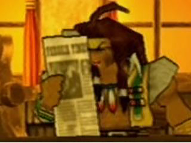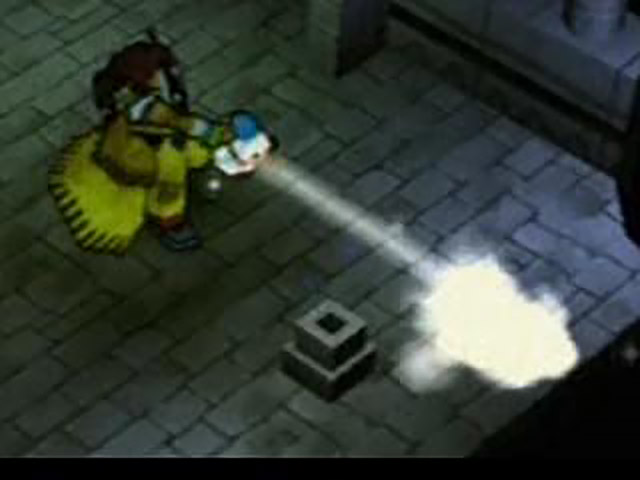Gallows reads something startling in his newspaper, giving us a two-second glimpse of his hilarious shocked face before we see a close-up of the article in question. The short piece concerns something called the “Ark Scepter”, a sacred artefact which is due to be transported via train to the colony of the Baskar Tribe. The Scepter “is said to be capable of communicating with the powers that sustain the world”. I thought that was something game designers did after a puff on their magic cigarettes? Bizarrely, the actual text of the article — not the quoted extract provided by the PTG — is completely unrelated to the Ark Scepter, instead blathering “Don’t want perish horribly? Sounds like a job for Call Whistle! Just give a quick toot and up to four living, breathing horses will materialize – poof! – before your very eyes!” Despite this seemingly random word vomit, there’s a picture of the Ark Scepter (which is, naturally, a crystalline phallus) next to the body of text, which takes this into a whole new realm of nonsense. I don’t even want to attempt to explain the thought processes behind this scene. Maybe they didn’t expect gamers to actually read the text of the article. But, if that’s the case, why would they go to the trouble of composing a fake article about Call Whistles (which do actually exist, but have no relevance whatsoever to the plot), when they could have just stuck the real description of the Ark Scepter in there? Oh, wait, that would have been the most obvious and logical decision. Never mind.