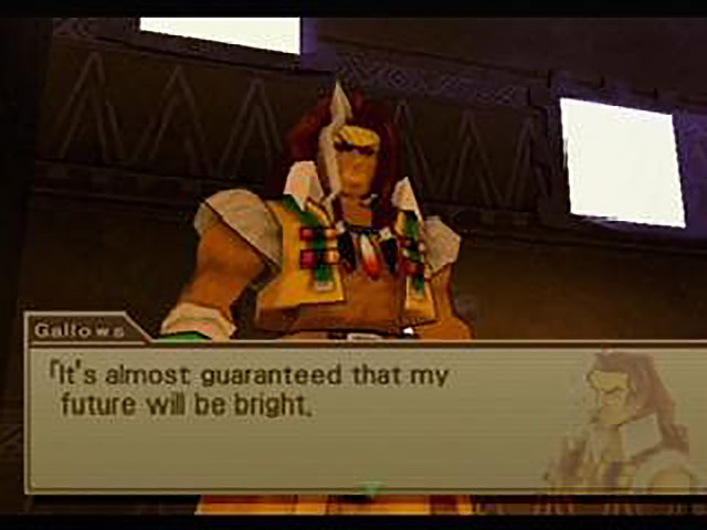 Sadly, nobody in the village has anything interesting to say. The most noteworthy individual Gallows comes across is a tiny little robot dude wearing a sombrero. As you probably guessed, he’s a Save Figure. I love how the WA people seem to think regular old save points are somehow beneath them, so we end up with the completely ridiculous alternatives of sombrero-wearing droids and talking pink parrots. Oh well, it’s just another shimmering thread in the beautiful, crack-induced tapestry of this game, so I’ll be nice and move on.