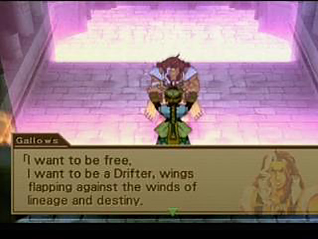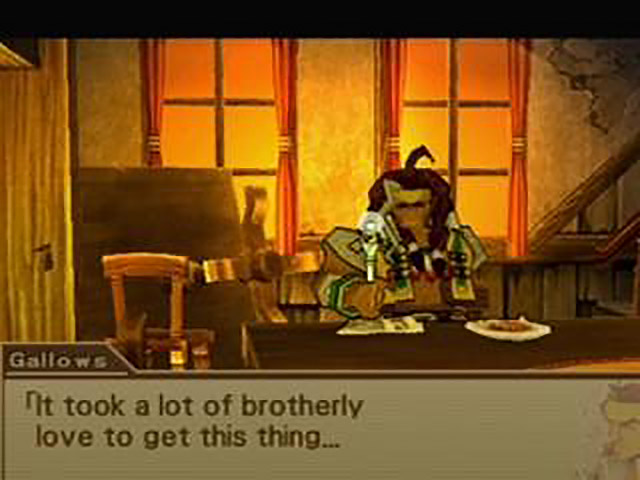 The Cock Scepter finally in his sweaty mitt, Gallows attempts to leave the Fallen Sanctuary, but runs straight into an invisible barrier just feet away from the exit. As he takes stock of the situation, the barrier before him lights up, illuminating a second wall that has just appeared behind him, effectively boxing him in. “Gimme a break! Another trap to repel thieves, huh?” he duhs, pounding on the solid wall of light as if it’s going to shatter under his mighty fists. “I’m an up-and-coming candidate for priesthood! Treat me like this and you’ll be sorry!” In response, a mystery speaker, identified by the text box only as ‘Creepy Voice’, hisses “Shh! Your cries for help will be heard outside.” “Who’s there?!” Gallows shrieks, even though he should have been able to identify the voice instantly — Shane steps into shot. “Aw, come on brother…who were you crying to?” he wonders, as slightly ominous music thrums away in the background. When I first saw this scene I thought we were heading towards an awesome and unexpected plot twist in which Shane turns out to be evil, but sadly, he was just fooling around with the whole creepy voice thing. Gallows is relieved to see his brother: “I knew I could count on you! You must have seen vile premonitions of your big brother in mortal danger, right?” Shane replies that he didn’t even need to predict this outcome — he was already sure Gallows would mess up somewhere along the line. He clearly inherited Sophia’s snarkiness.