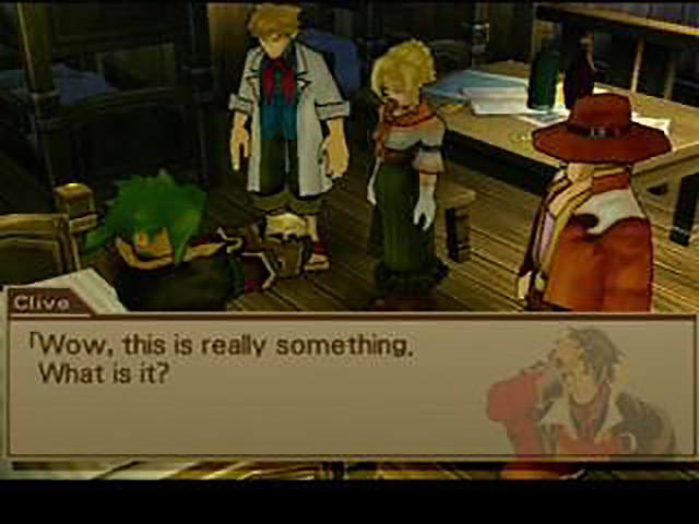 “It’s not a question of ‘if’, it’s a question of ‘when’…” the PTG proposes, concluding the rollercoaster ride that was Clive’s flashback. We never find out who exactly he’s addressing here, as we abruptly cut to someone’s bedroom. I don’t like where this is going. Oh, look, Clive’s laying on the bed! I really don’t like where this is going, considering who he was with the last time we saw him in a conscious state. But my fears seem to be unfounded, as Clive is fully-clothed and Borgnine the sex-pest is nowhere to be seen. In his place, however, is an icky woman. “Oh, you’re awake!” the woman — named Fram — squeals. She’s dressed like a saloon wench or a hooker — I can’t decide which — so this scene could potentially go in some interesting directions. Fram tells Clive she’s going to “go make something”, which intrigues me even more, but sadly she’s just taking about a hot drink. As she whips up Clive’s hot toddy (no, that’s not a euphemism), we get a fleeting visit from a Black Screen of Lazy Game Designers, and when it leaves, Borgnine and a random guy in a lab coat are standing over Clive’s bed. I’m sure they stole this scene from a porno. As Borgnine and Lab Coat watch intently, Clive sips from Fram’s cup and…wait, I’ll rephrase that. As Borgnine and Lab Coat watch intently, Clive takes a gulp of his drink before holding the cup out in front of him in amazement, like it’s the Holy Grail or something. “Wow, this is really something! What is it?” he gasps. Borgnine, growing creepier by the second, is only too happy to explain: “Knocked your socks off, huh? Well, here’s a hint.” He fumbles around in his pocket (I hope it’s just his pocket) then produces a sprig of a suspicious-looking herb. Taking into account this series’ abundance of drug references, it would be easy to assume that the herb in question is marijuana, but it’s just an antidote. Or so they tell us.