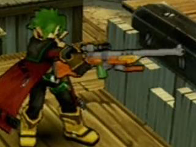 After a second batch of credits, we’re on the roof of the train. Gallows helps Vagina up through the hole (ew), giving fanfic writers everywhere evidence that they’re doing each other. I should point out that, despite the emergency brakes being applied earlier, the train is still moving at a considerable speed. I’ll come back to this point in a while. The foursome comes face to face with the people behind the emergency brake-pulling and the explosion — a trio of interesting-looking individuals, the leader of whom is a man sporting royal blue hair, white pants and a phallic bayonet. I can safely assume I don’t need to speculate on his sexual orientation. His two accomplices also look gay, but in very different ways: the man to his right is a fey-looking fellow with bleach-blonde hair, a fashionable scar across his eye and a one-hand-on-hip pose, while the guy to his left is a heavy-set bear with a thick goatee and dangerous-looking PENIS in hand. I guess it’s no surprise that these guys seem to be after the sparkly Cock Scepter.