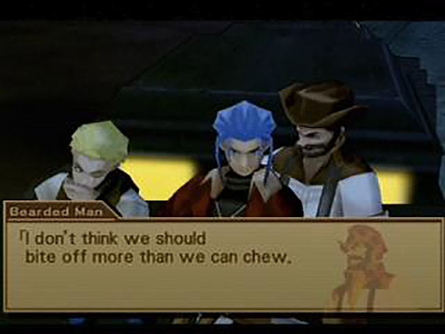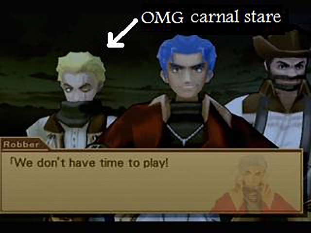 Bayonet Guy suddenly pulls out a pocketwatch, notices the time, and yells “Time is money. Let’s get this started already!” Bear Guy reminds him that “[they’re] one short without Lucio”, but we don’t find out exactly who this Lucio dude is. Maybe he was kicked out of their group for appearing too straight? Whatever the circumstances of his absence, we finally learn that Bear Guy is called Dario, Blonde Guy is named Romero, and Bayonet Guy himself has the fabulous, completely straight name of Janus Cascade. His nickname is staring me in the face, and I only have to delete one letter of his real name to get it. Janus Anus yells “Shut your fly, Dario!” (leading me to speculate why it was open in the first place), followed by “Be a man, Romero!” I don’t think it’s the first time he’s said that, for some reason. His final instruction before the battle is something about assuming positions, and it probably isn’t the first time he’s ever said that, either.
