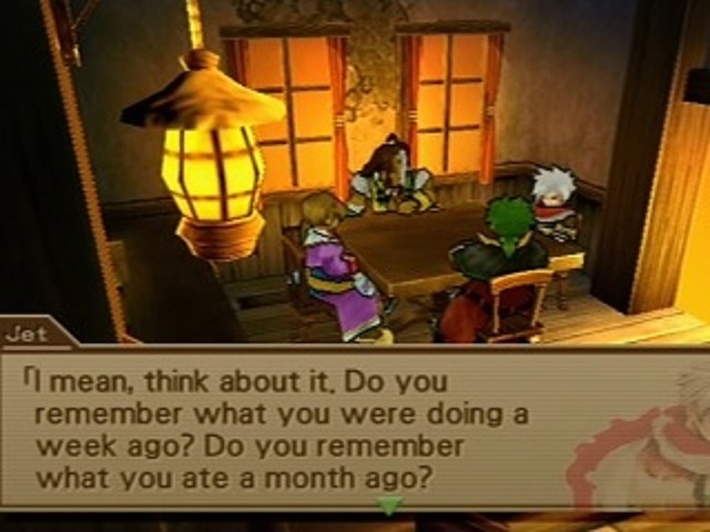 I know it hardly seems possible, but the scene gets even worse. Remembering she’s the heroine of this debacle, Vagina claps like a seal and declares happily that she has a new objective — she’s going to help Jet find his memories! How she plans to achieve this, I have no idea, and I’m not sure I want one, especially if it means we’re going to be treated to numerous “heartwarming” scenes of the two of them bonding. There are only so many receptacles in the house for me to throw up in. In fairness to Vagina, she honestly has no need or obligation to help Jet like this, especially given how much of a dick he’s been towards her thus far. But I guess when you’re the bastion of goodness that is an RPG protagonist, you even have to do nice things for people who deserve a kick to the ‘nads.