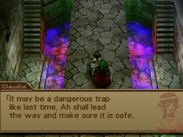 It gets even more hilarious. Resigning myself to the fact that the game designers won’t let me continue without springing their incredibly subtle trap, I reluctantly play along and have Jet step onto the walkway. Hey, if one of these idiots needs to take a hit, it might as well be him. But once he’s in prime position to be pulverised, Claudia pops out of his rectal cavity and offers to pull the lever for him, insisting that she just wants to help. “Ah can’t subject you all to a precarious situation…” she says with the utmost sincerity. No, please do. Before Jet can protest, she flips the lever, opening the locked door at the far end of the room, and also — SURPRISE — setting off the trap nobody had noticed. Unfortunately, Jet steps out of the way of the phallic battering ram mere seconds before it can crush him into powder. Why can’t I ever have nice things?