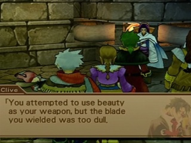 As a boss, M’lady is a complete pushover, not least because her psychotic rage means she only ever targets Clive. As he’s a freaking tank in comparison to the others, this tactic doesn’t quite pay off for her. “I will not forgive you for trampling over my feelings! Or my beauty!” she bawls prior to one of her ineffective attacks. Christ almighty, let it go. In all seriousness, her particular brand of crazy is starting to scare me, and her boss music isn’t helping. After a few more turns of trying to punish Clive with her “Eliminate Scanner” — I’m not quite sure how her attacks work, so I’m going with nanomachines — she keels over, melodramatically soliloquizing, “I need more Panakeia in my circulatory system…has [Feelgayer] denied my existence?” Most probably, since that’s what I’ve been trying to do for the past twenty minutes. Also, I take it “Panakeia” is the brand of anti-psychosis meds she’s been forgetting to take.