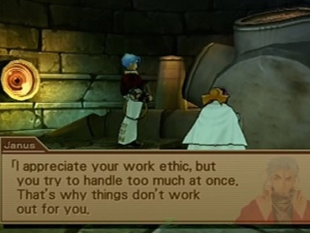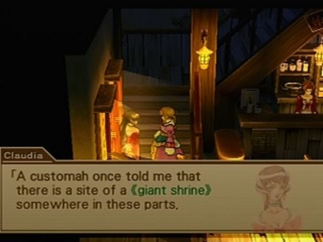 After another revelatory discussion which sheds new light on each of the characters (Vagina: WHY ARE MEN SO DUMB, Gallows: CHICKS CHICKS CHICKS, Jet: I’M A LONER, Clive: PLEASE DON’T ASSOCIATE ME WITH THESE IMBECILES), I’m free to gather information. By which I mean I have to drop in at the saloon and speak to Claudia. Who probably could have given me this hot gossip in the previous scene, but that would have saved me a few seconds of game time removed the illusion of player agency, and we can’t have that. Happy to catch up with the people she hasn’t seen in an entire minute, Claudia discloses that a “customah” once told her of an ancient shrine for Guardian worship, located to the southeast. Hey, that’s the direction the weird light from the night before flew off in! What a coinci–oh, OK, I’ll stop.