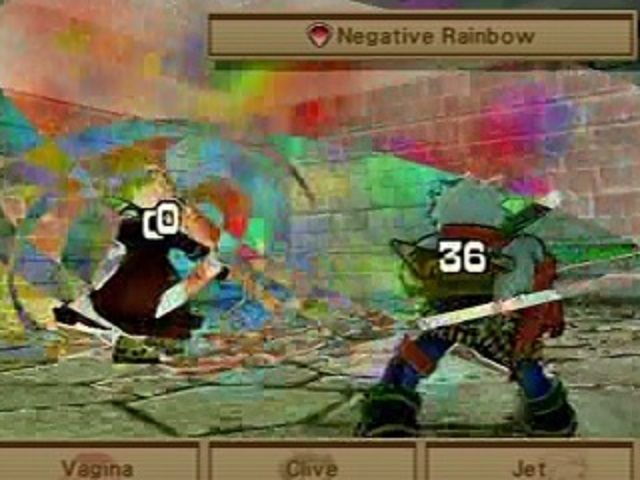 I’ve already fought this dick like a hundred times, and at no point will these battles ever be interesting, but New and Improved Anus has one unfamiliar trick up his sleeve — a new attack called “Negative Rainbow,” which essentially involves him using Soul Edge to jizz a mass of multicoloured lasers all over the party. In short: extremely festive major ouchies. I didn’t think it possible for Anus to become even more gay, or even more annoying, but he somehow managed it. Luckily, he can only deploy his overpowered rainbow spooge every second turn, so Gallows can easily heal in between loads. Yes, this means Gallows is actually being useful for something. I’m as shocked as you are. Anyway, it doesn’t take long at all for Clive and his superior PENIS to put Anus on his…well, anus. For what feels like the fifty-eighth time. Afterwards, he feebly blames his loss on the “time lag” between his thoughts and actions, not being 100% accustomed to his new powers yet. Hey, at least when I use that excuse, I admit the alcohol may have played a part.