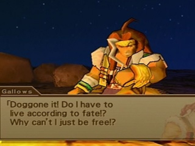 Once they’ve established that the demons are real (um, didn’t they already know this?) and that one of them is in all likelihood now inhabiting Anus, the gang wants to call it a night. But Gallows isn’t finished! Showing remarkable insight (and I’m going to just assume this was some kind of translation error), he remembers that his gay little brother Shane had prophesied the re-emergence of demons in his dreams, and that his amazing granny Sophia had probably anticipated the coming events. “We’re all just marionettes being forced to dance by invisible strings!” he drama-queens, unwilling to accept the fact that he’s just a player in his grandma’s scheme. I’d have used “dummies” in place of “marionettes,” personally, but I guess the analogy holds water whichever way it’s phrased. So, Sophia orchestrated the meeting of three Drifters capable of invoking the power of the Guardians (plus the annoying grandson she wanted out of her hair) and sent them off into the wasteland wielding the Mediums, hoping they’d be able to combat the emerging threat. We kind of already knew all of this three recaps ago, but the reminder is appreciated. As if on cue, each party member’s Medium suddenly produces an orb of light, which spirals up into the air and flies around spastically for a while. These orbs combine to create a single larger ball, which eventually shoots off into the night sky…to the southeast, according to Clive. Hey, I usually have to interrogate random NPCs to find out where to go next! It’s so exciting when the game decides to mix it up a little!