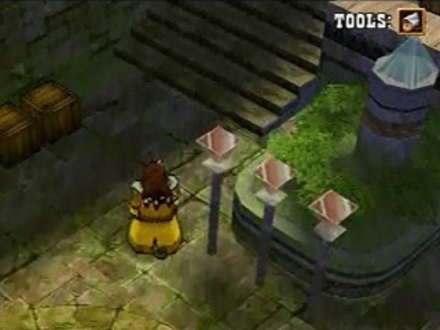 As luck would have it, most of the umpteen other puzzles are of the simple “use Steady Doll to push out-of-reach blocks into switches” variety, as opposed to the altogether more complex “use Steady Doll to trip out-of-reach levers” conundrums. Eventually the identikit stone hallways give way to an outside area festooned with greenery, which the game designers probably threw in so that the dungeon’s name made at least some kind of sense — not that they usually bother to make the effort. Three crystalline buttplugs are strategically placed around the area, along with three smaller, inverted ones atop poles. Such buttplugs usually fall under Clive’s remit, but oh no — they’re all sitting on waist-high ledges he can’t possibly climb onto! How on Feelgayer is he going to bomb them from ground level!?