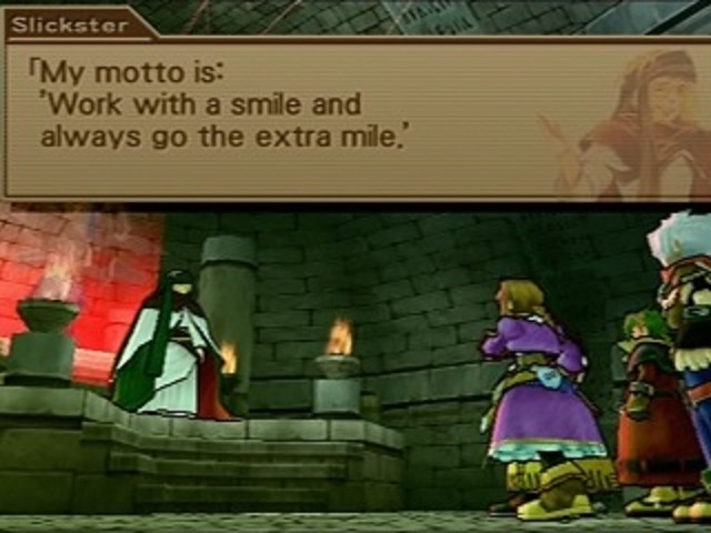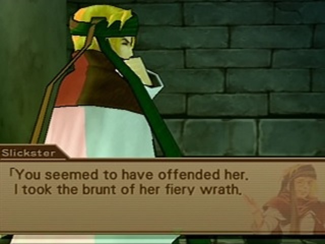It turns out Anus isn’t thrilled at the prospect of fighting the party yet again either — he’s been hiding behind a pillar this whole time, probably praying Slickster would forget he was there. It’s like even he’s trying to tell the game designers how tiresome these confrontations are becoming. Anyhow, Slickster chews him out for not immediately jumping into the fray, then cries, “If I cannot count on the Dark Knight, then I will take matters into my own hands!” Wait, “Dark Knight?” If Batman showed up right about now, it might make this scene slightly more interesting. But no such luck — instead, Slickster rolls up his sleeves and calls up the insanely creepy boss music he shares with M’lady.